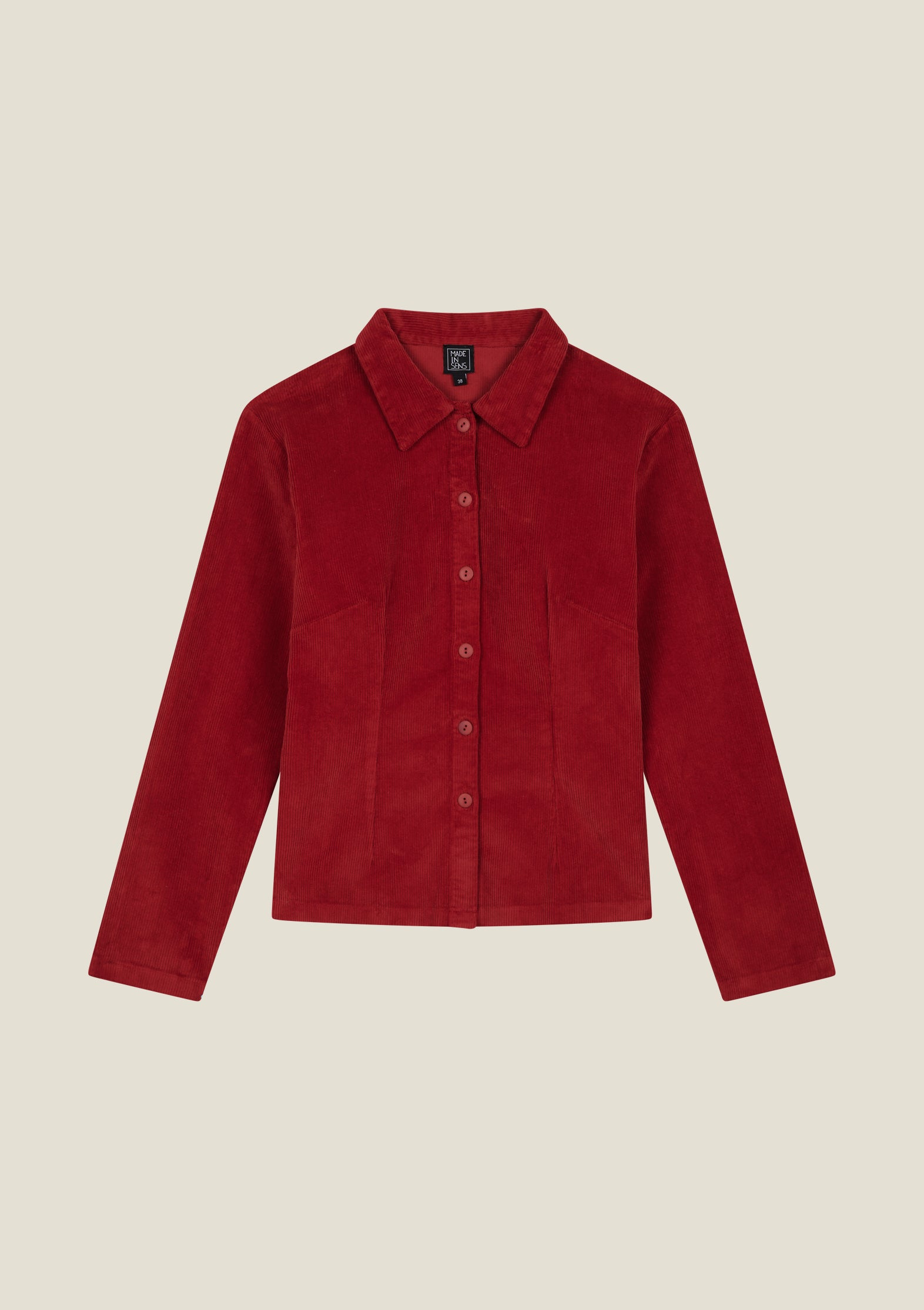 Surchemise en velours ceinturée à manches longues. Se boutonne jusqu'en haut. Petite fente sur le côté.