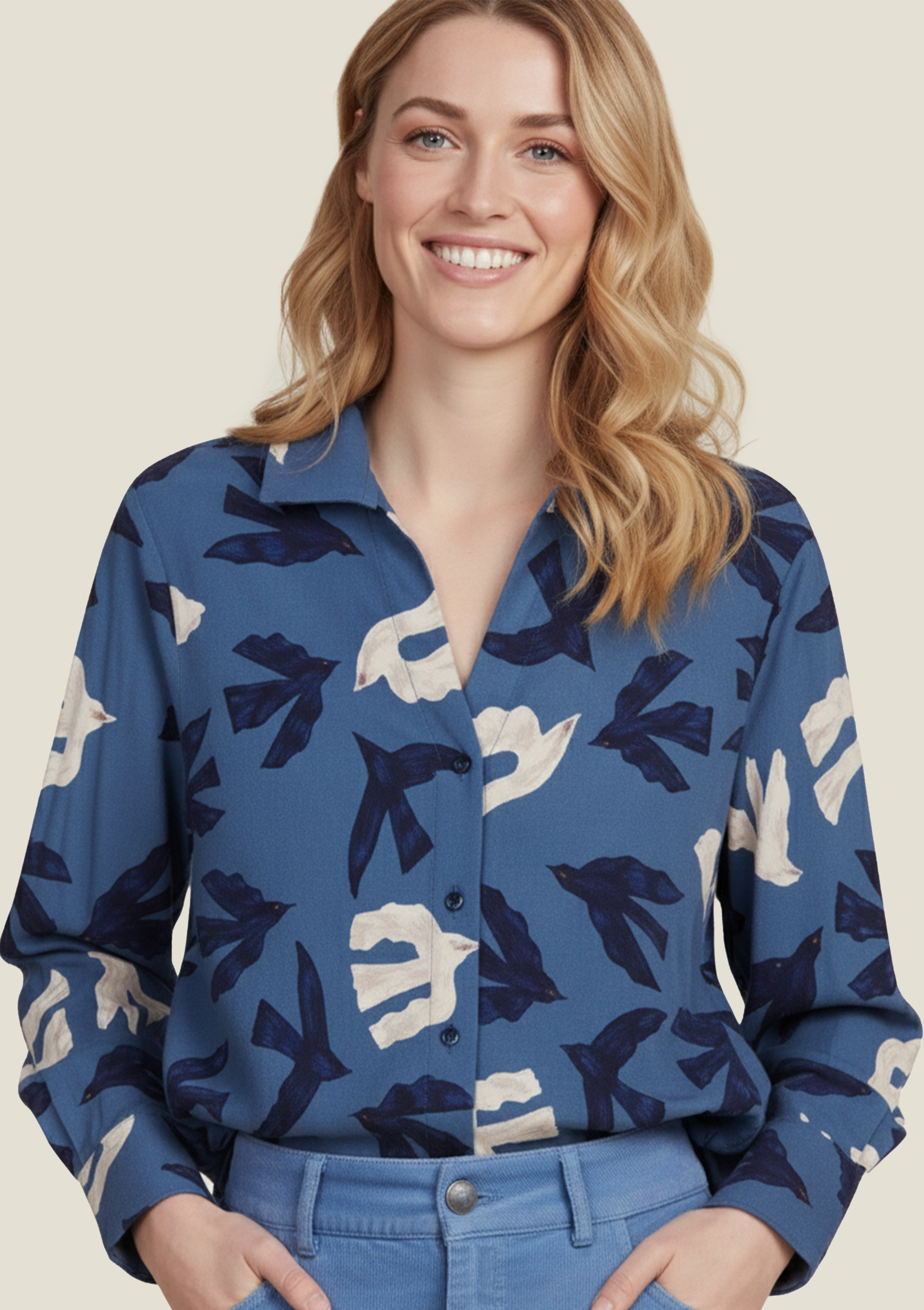 Inspirée des illustrations douces et rêveuses de Clara Super Duper, cette chemise dévoile une envolée d’oiseaux sur fond bleu océan. Son tissu fluide et doux offre un confort idéal, tandis que sa coupe évasée et son col ouvert flattent la silhouette.