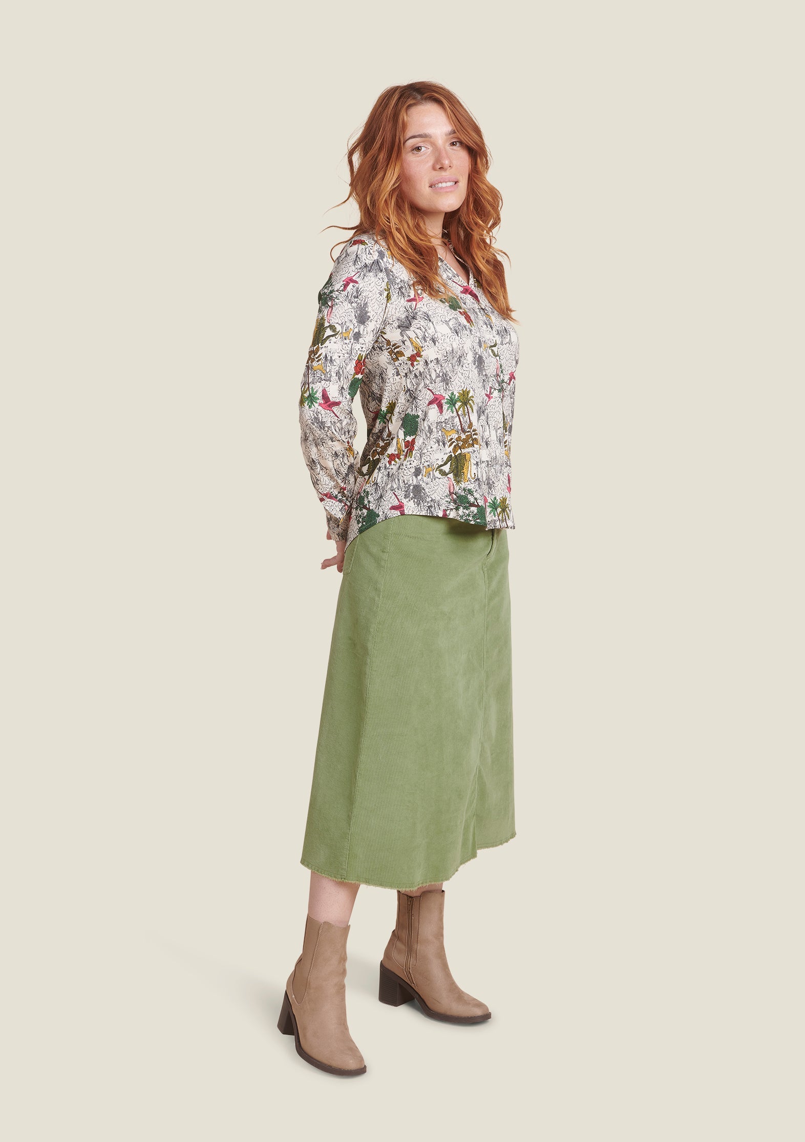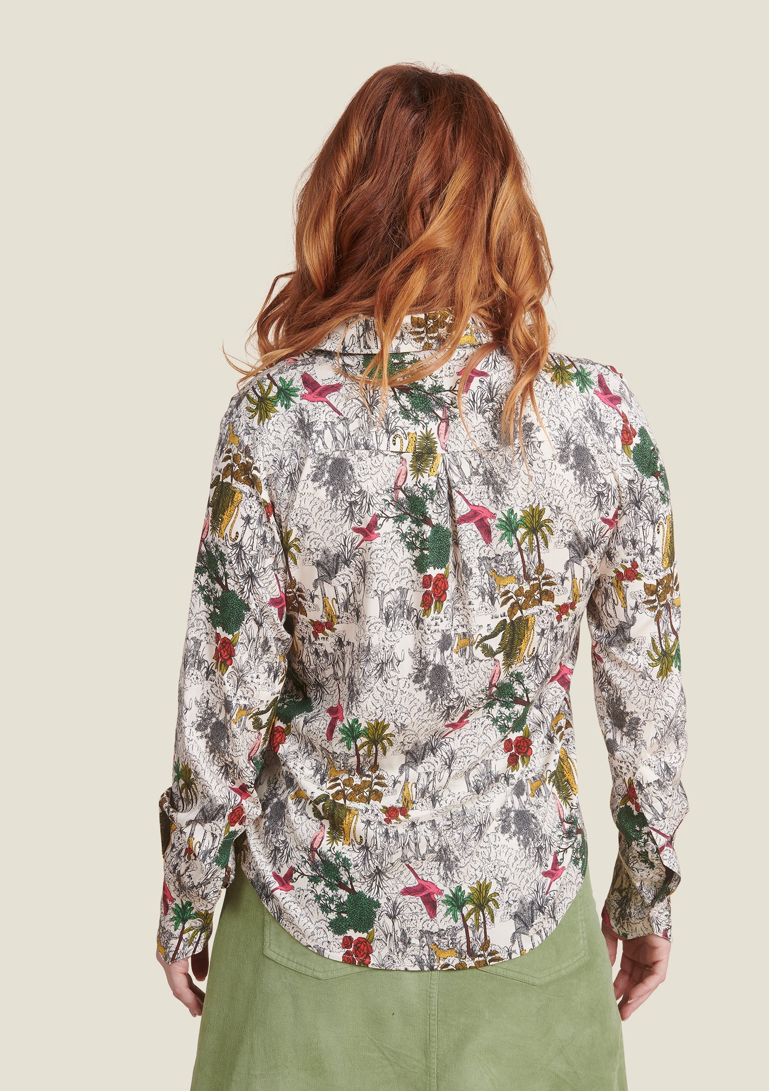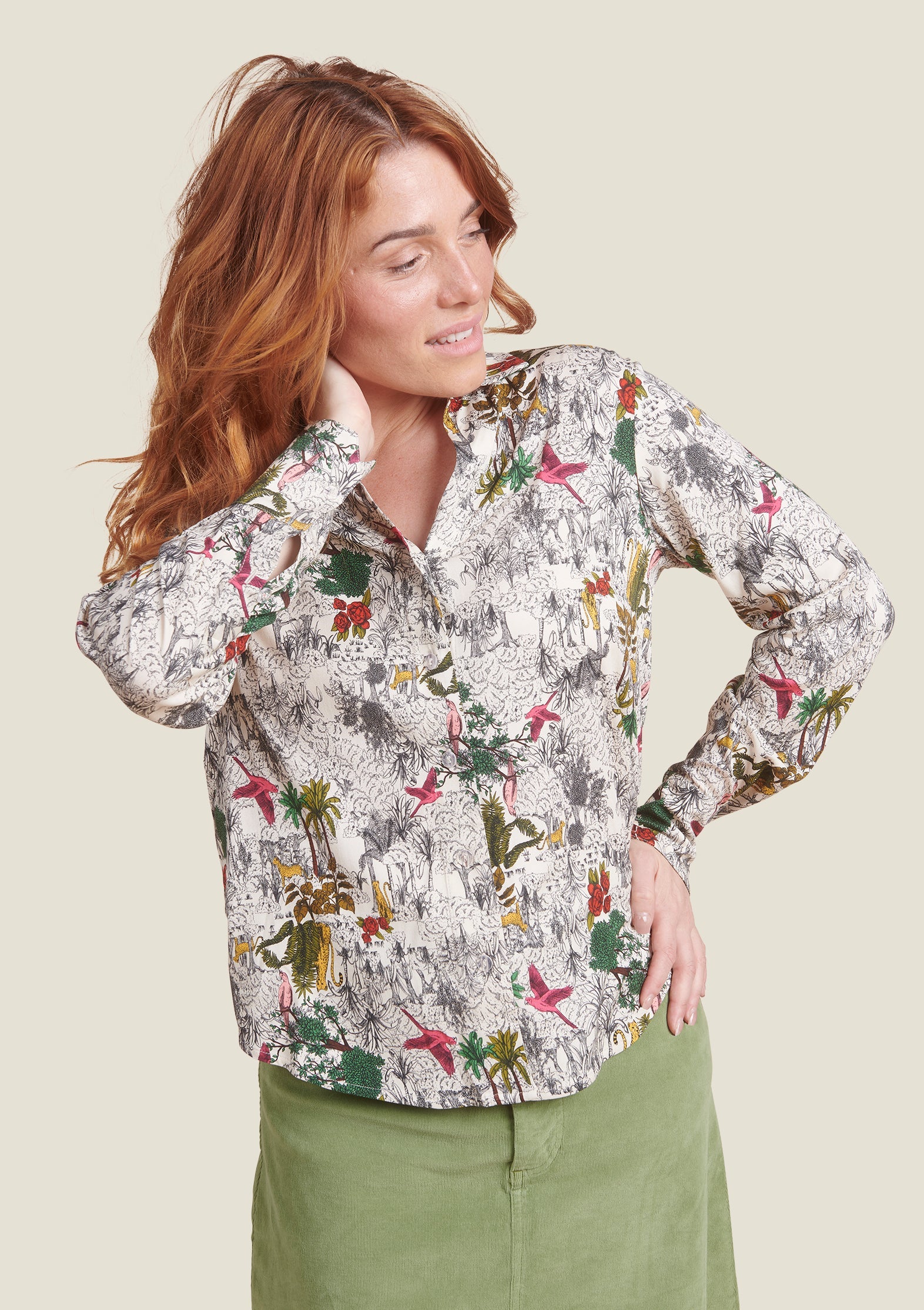 Imaginée par Sophie, cette chemise met en scène un motif finement dessiné, proche de la gravure, où la jungle s’invite comme une touche de couleur vive et sauvage. Son tissu fluide et doux en viscose FSC et élasthanne accompagne chaque mouvement avec élégance.