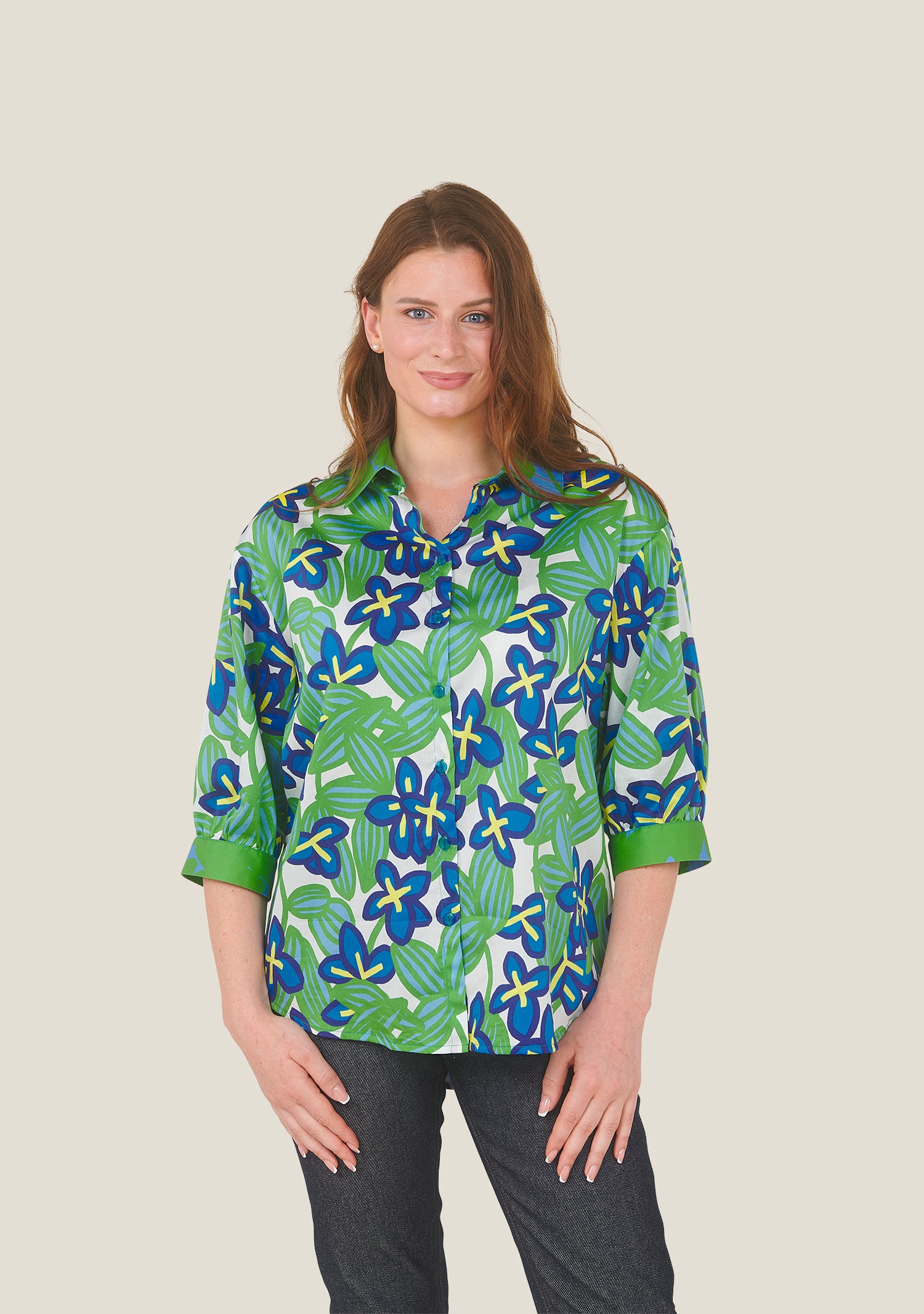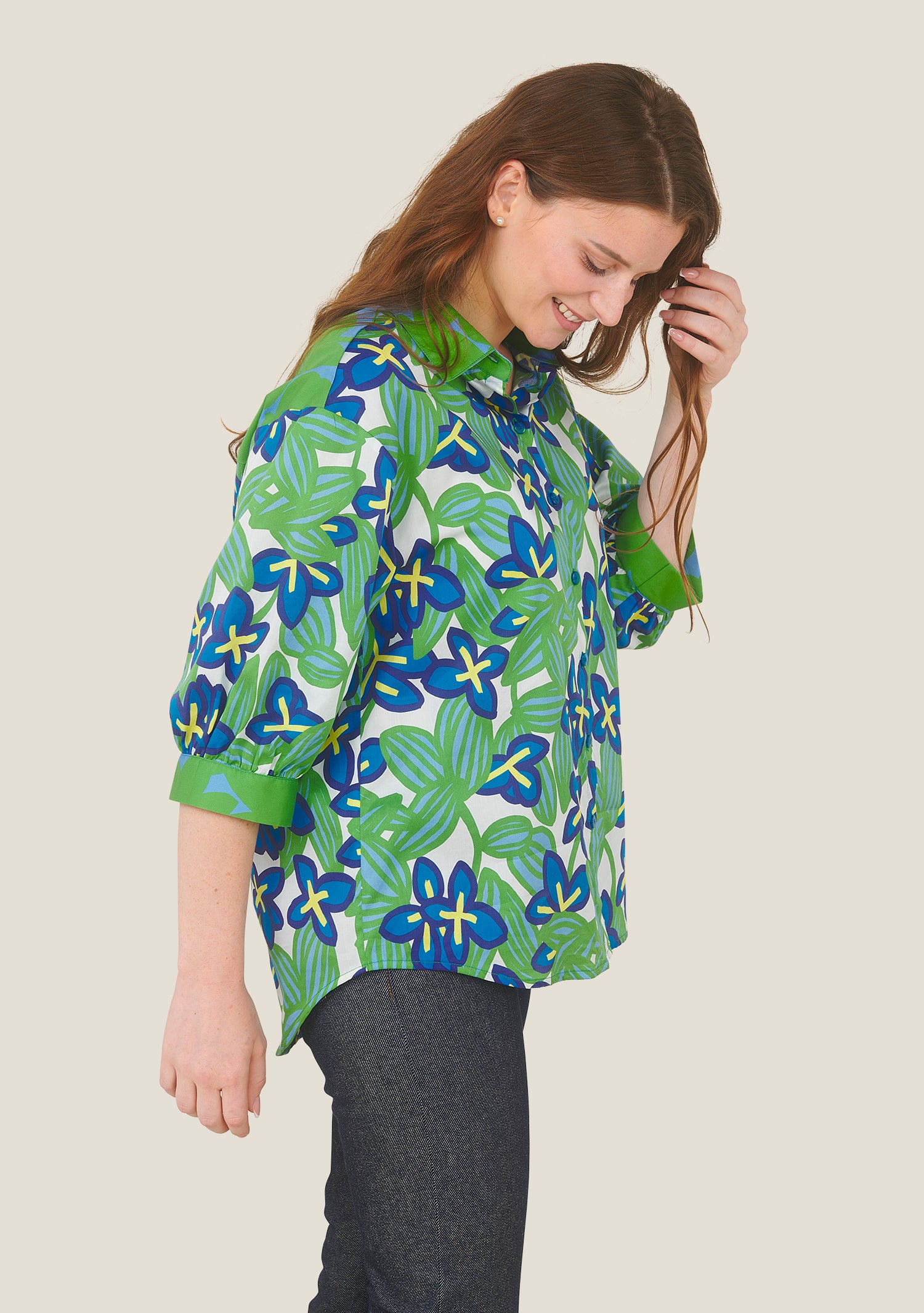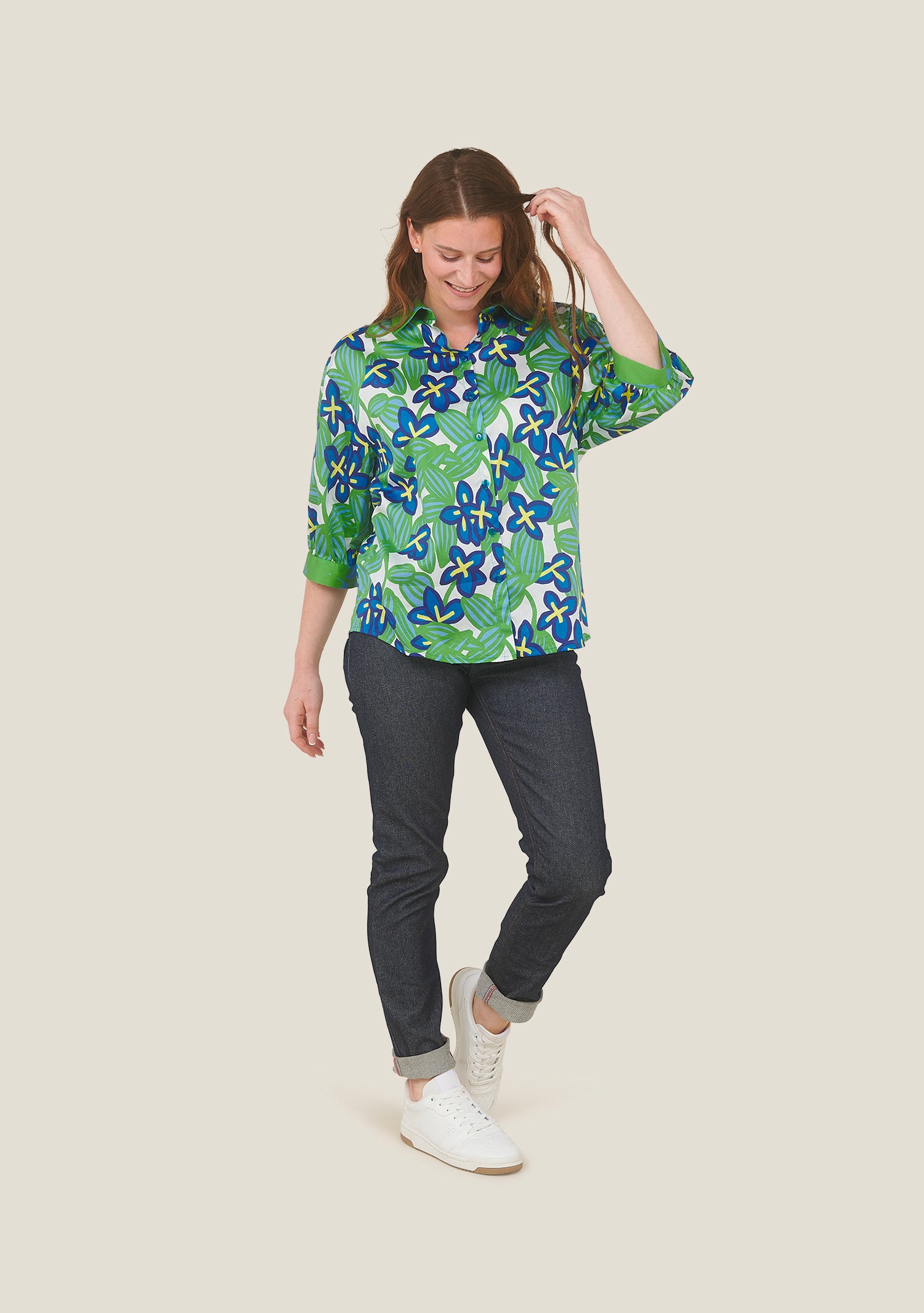 Son motif Bosquet vert, inspiré de la nature, s’associe parfaitement avec des pièces unies bleues, des tops verts ou des tissus légers céladon. Pour un look chic et travaillé, associez-la à une jupe ou un pantalon ample et complétez avec une longue veste esprit kimono. Lors des soirées plus fraîches, ajoutez une maille assortie Bosquet.