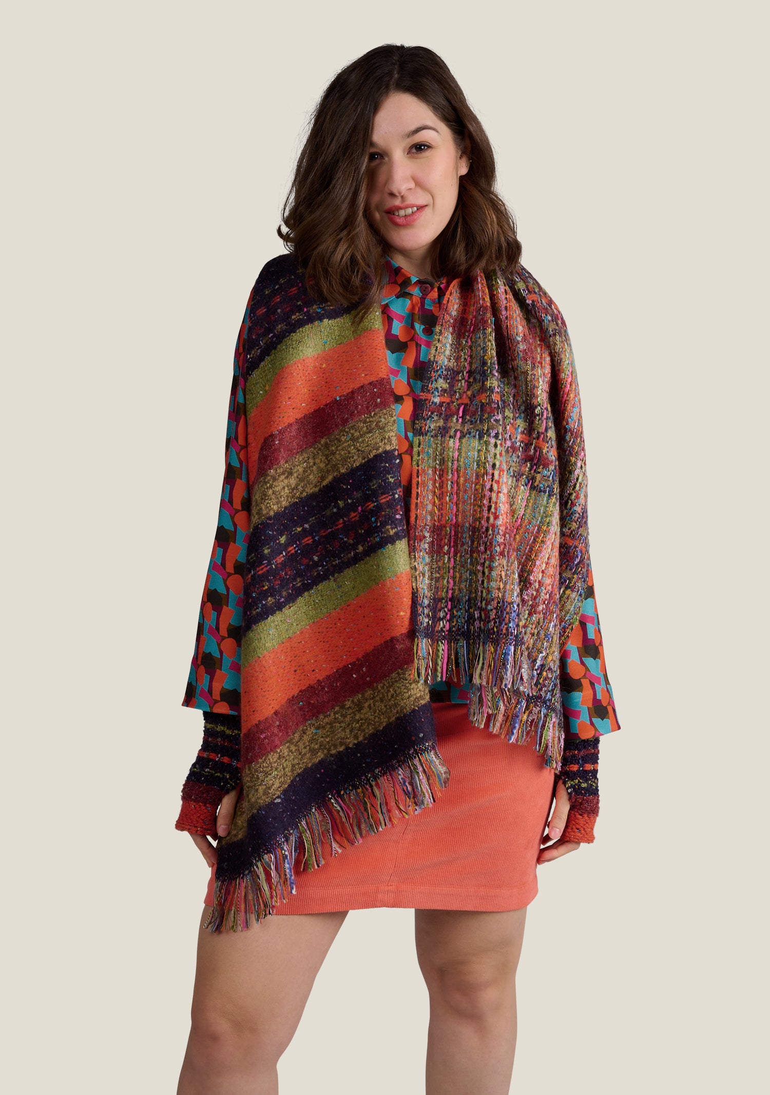 INFOS ARTISTE ET MOTIF : Cette grande écharpe Étole Rayures Orange vous permet une multitude de styles de nouage, offrant de la diversité dans l'apparence et permettant de personnaliser votre look.