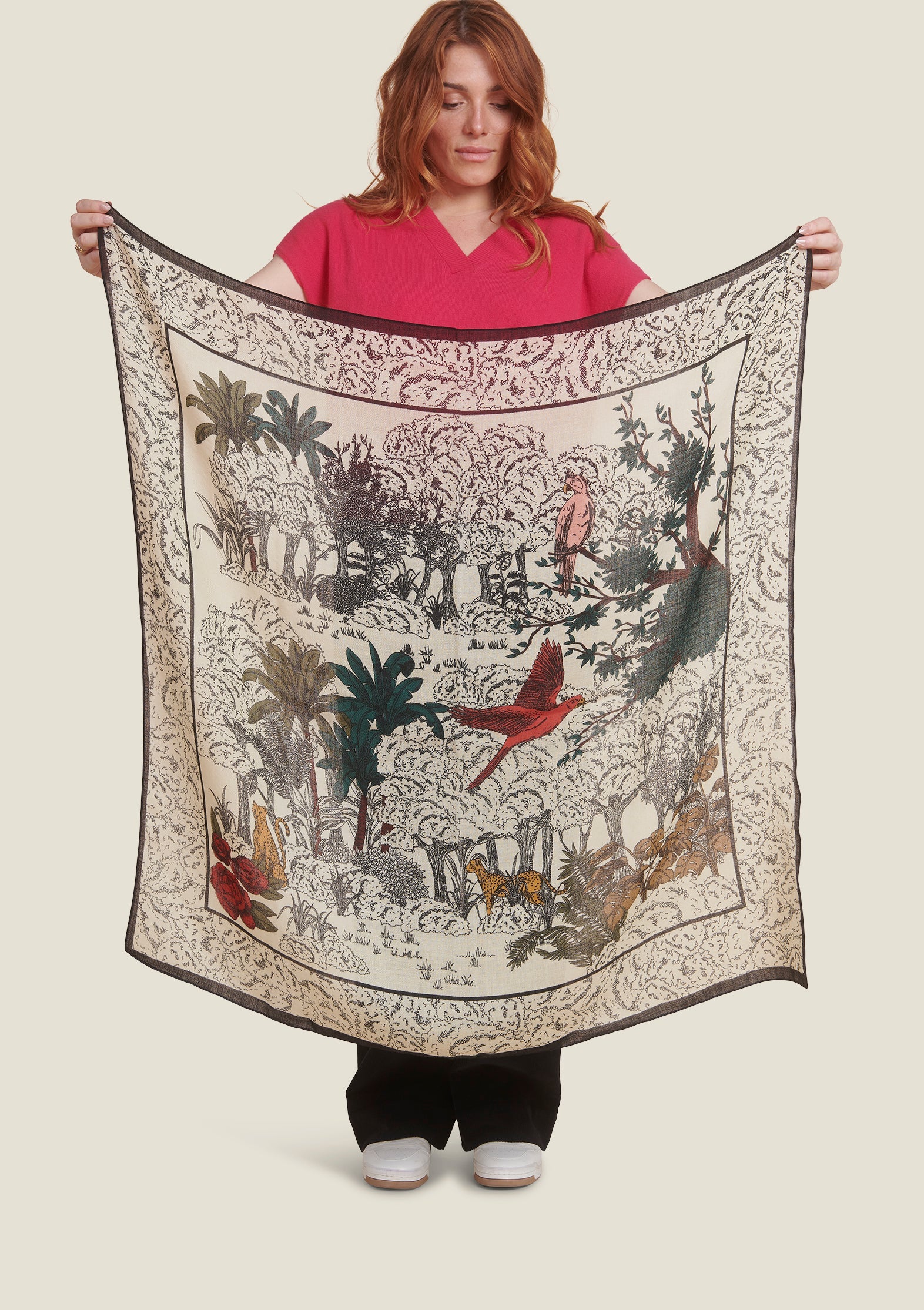 InspirĂ© des anciens papiers peints, ce foulard allie la dĂ©licatesse dâun dessin au trait façon gravure Ă une touche sauvage venue tout droit de la jungle. Des tĂąches de couleurs viennent Ă©gayer cette scĂšne presque sonore, oĂč lâon imagine bruissements de feuillages, chants dâoiseaux et Ă©chos de fauves lointains...
