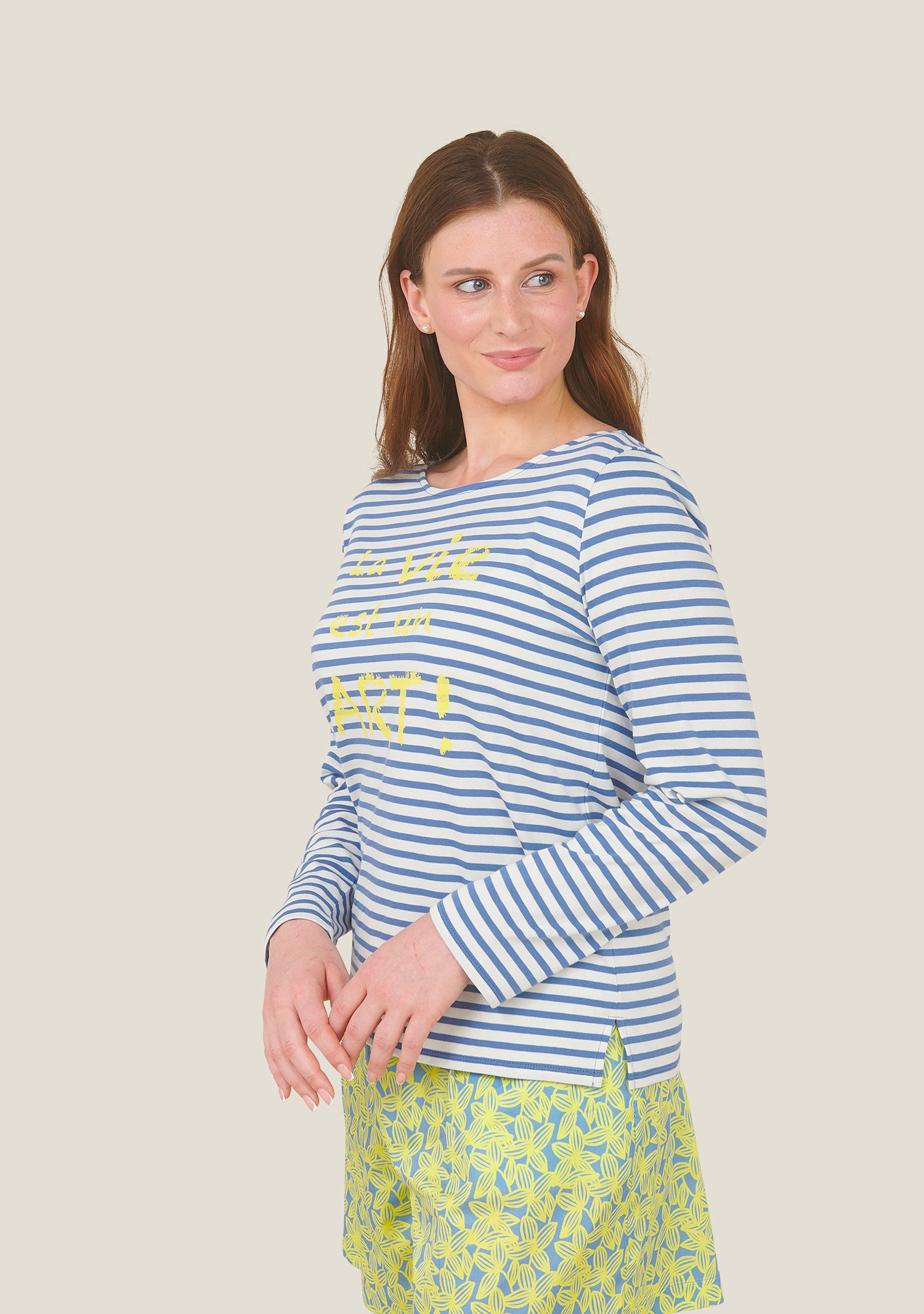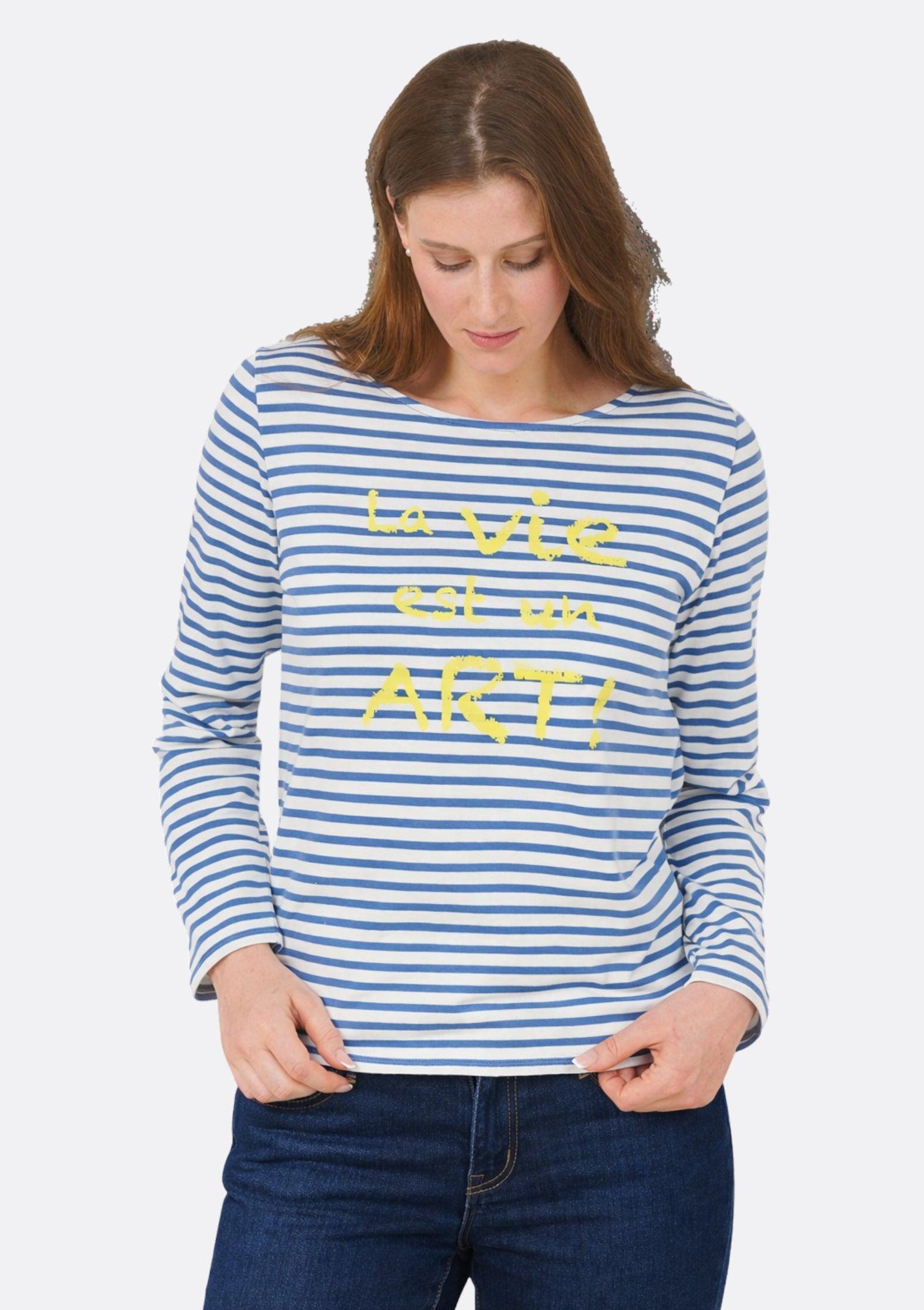 La marinière Marin "La Vie est un Art" revisite le classique t-shirt à manches longues avec une touche de fantaisie et d’inspiration. Son imprimé rayé intemporel est rehaussé par une phrase jaune impactante, qui porte la signature Made In Sens : "La vie est un art".