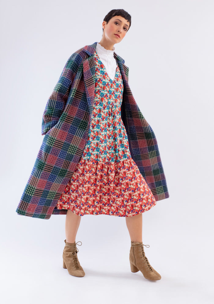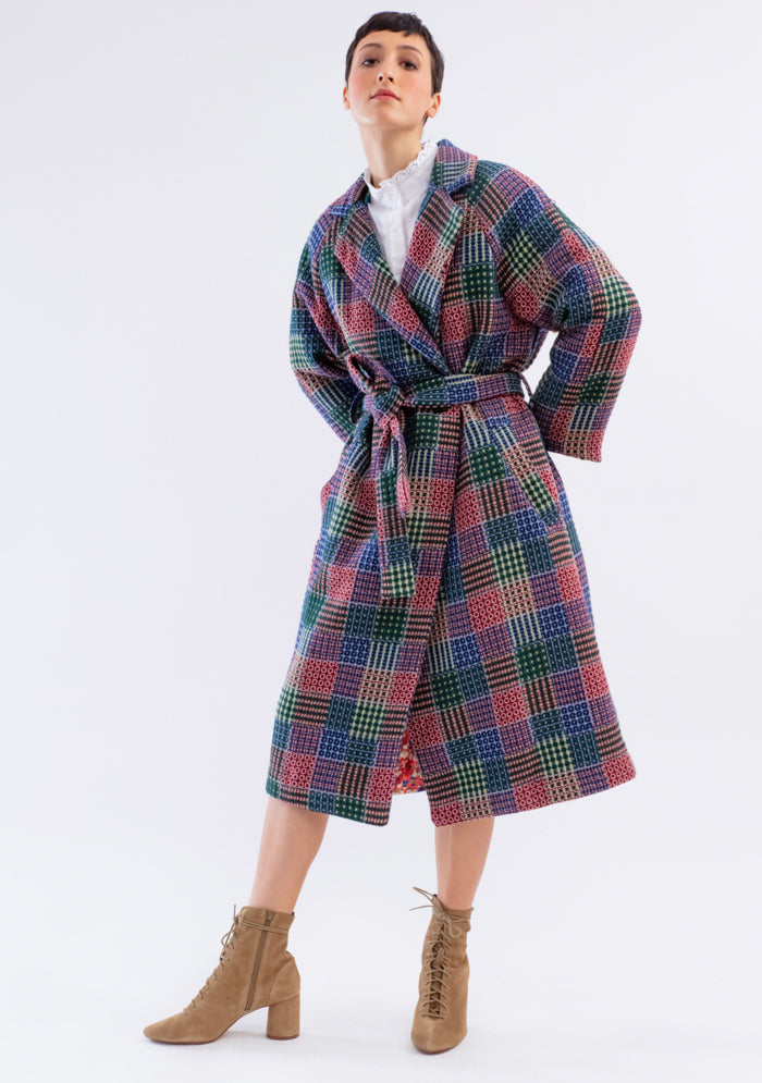 Carreaux fondus se porte très bien sur de petits imprimés, est assez long pour nouer sur les robes longues , volume très confortable on peut mettre une doudoune ou nos gros pulls dessous.