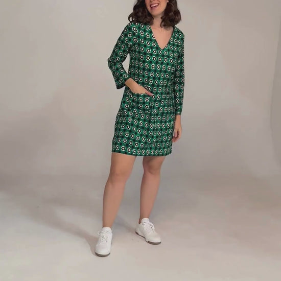INFOS ARTISTE ET MOTIF : La Robe Rougi Twig Vert est une robe trapèze mi-longue au col V, avec des poches pratiques qui allient style et confort. Parfaite à porter seule ou avec un col roulé pour plus de chaleur, cette robe s’adapte à toutes les saisons. Son imprimé, créé par un studio basé à Côme en collaboration avec des artistes et designers textiles italiens, nous plonge dans l’univers des années 60 avec un clin d’œil à l'esprit "Chapeau melon et bottes de cuir" et à la célèbre minijupe de Mary Quant. Un mélange de rétro et de modernité pour un look unique et élégant.