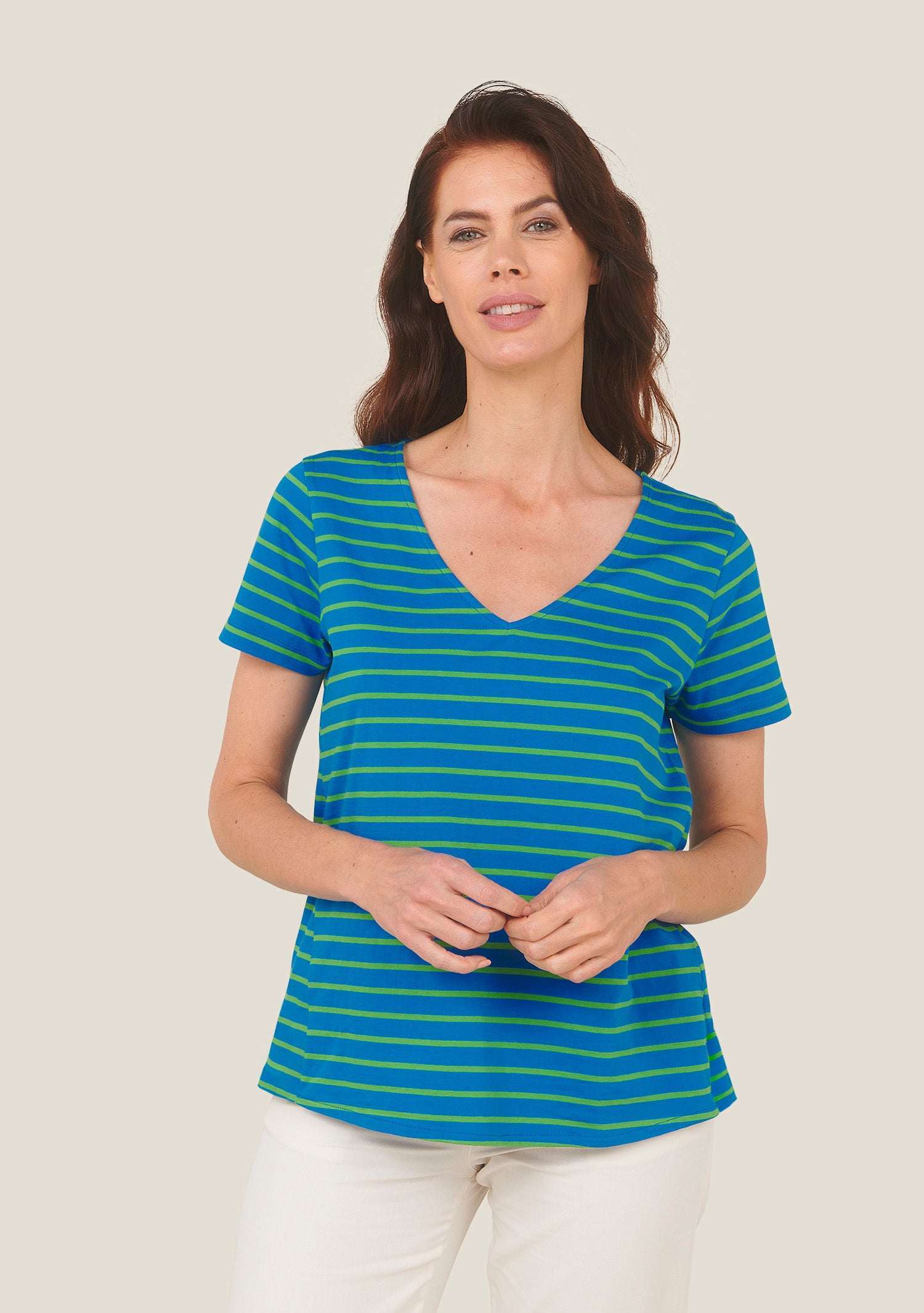 Ce t-shirt rayé intemporel est un véritable basique revisité, idéal pour accompagner les imprimés des thèmes Bosquet et Ombres Vert. À porter avec un pantalon ample, une jupe fluide ou sous une veste légère, il s’adapte à toutes les occasions.