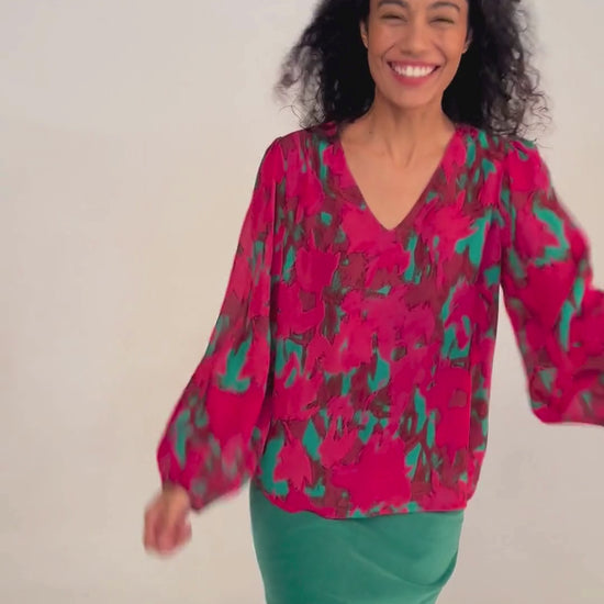 Blouse forme trapèze. Col V Manches ballons. Zip sur le côté.